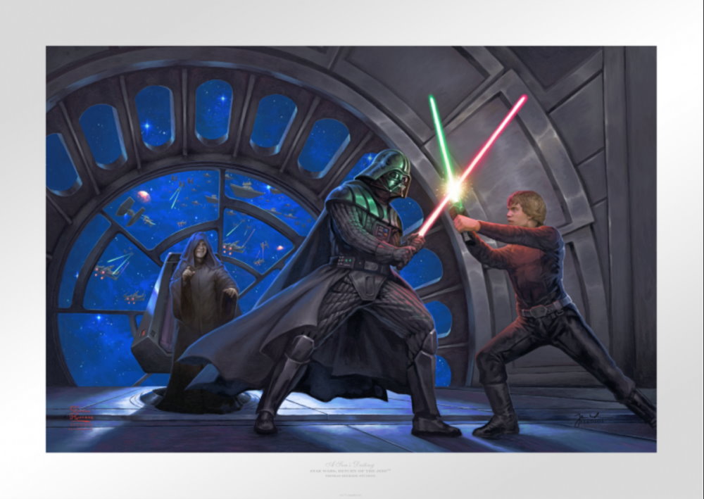 The space battle between the Imperial TIE Fighters™ and the Rebel X-wings™ continue behind Emperor Palpatine™ who is enthralled by the Lightsaber™ duel of Darth Vader™ and Luke Skywalker™. Is this the final encounter for father and son? The Emperor encourages Luke to kill Darth Vader and to take Vader’s place at his side. Luke declares that he is a Jedi Knight™ as his father Anakin Skywalker™ was before he turned to the dark side. An enraged Palpatine states he will then himself kill Luke. The Emperor’s action brings Darth Vader to realize he needs to save his son Luke, only to lose his own life. In “A Son’s Destiny” by Thomas Kinkade Studios good finally does conquer evil.