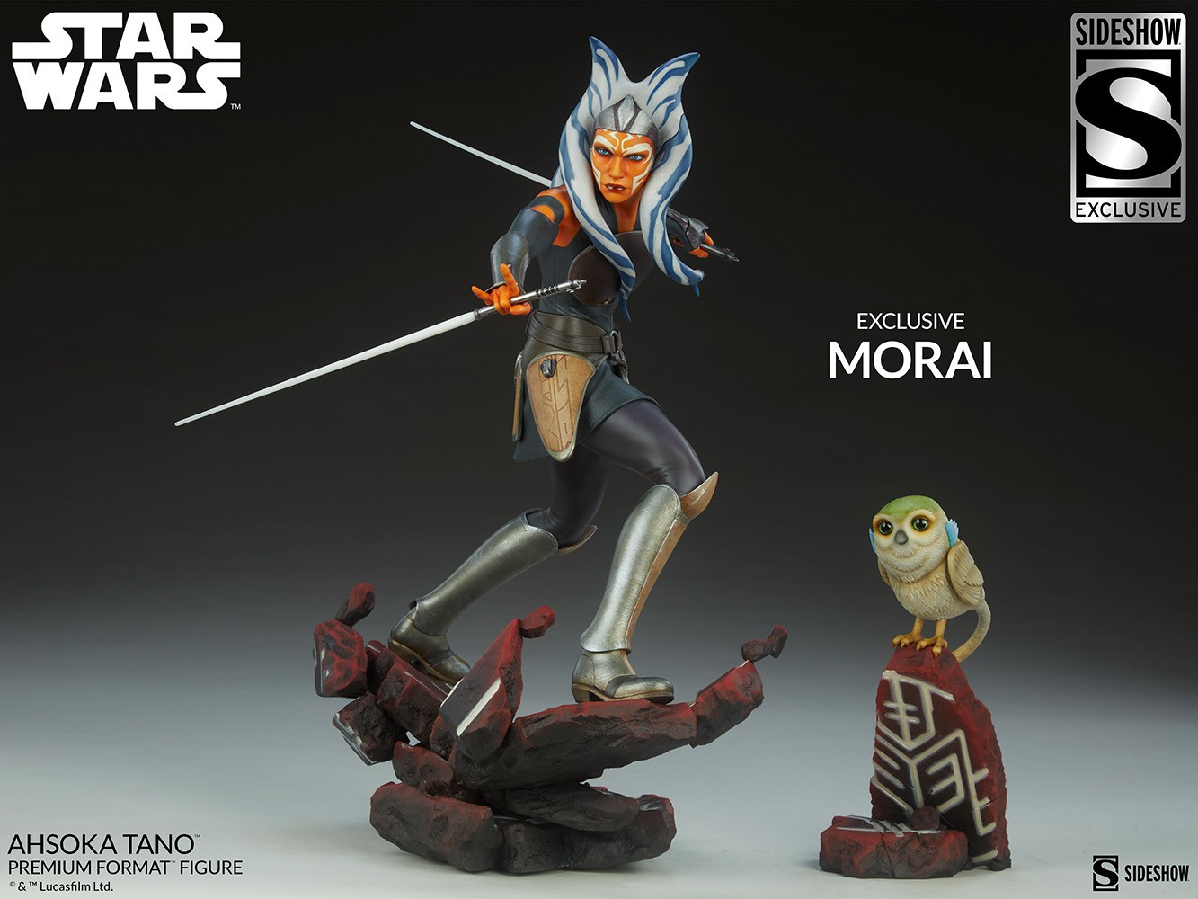 The Exclusive Edition of the Ahsoka Tano Premium Format Figure includes a sculpted Morai proximity piece, depicting her beautiful green convor companion perched on a complimenting Malachor rubble base. Display Morai alongside the Togruta Force wielder with this exclusive accessory only available through Sideshow.