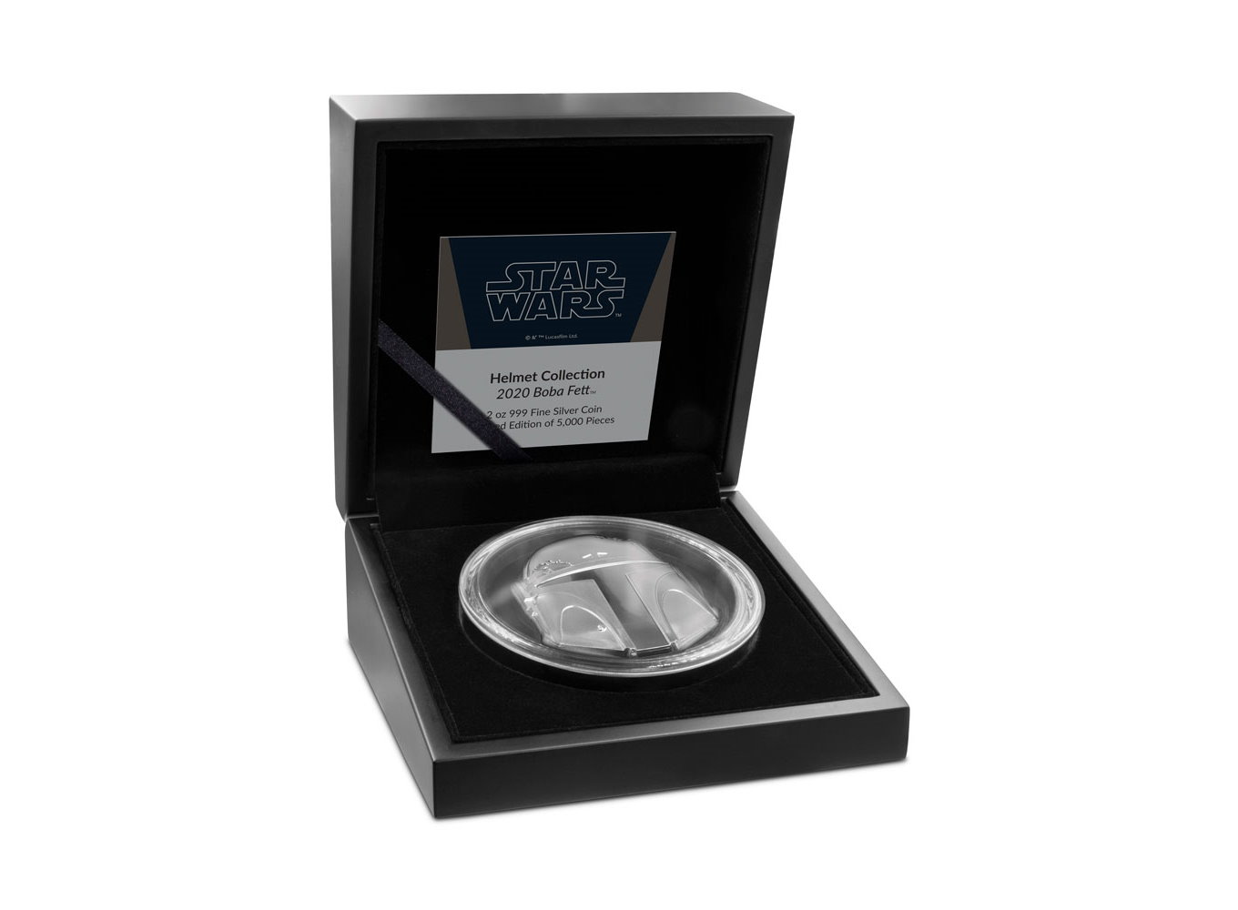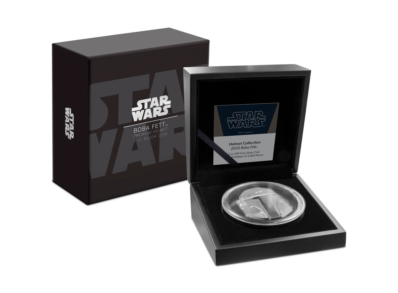 This unique coin follows the shape of one of the most well-known helmets – that worn by the notorious bounty hunter Boba Fett™. A weighty 2oz pure silver, this coin has been minted using ultra-high relief technology to create the striking detail, including the infamous dent!