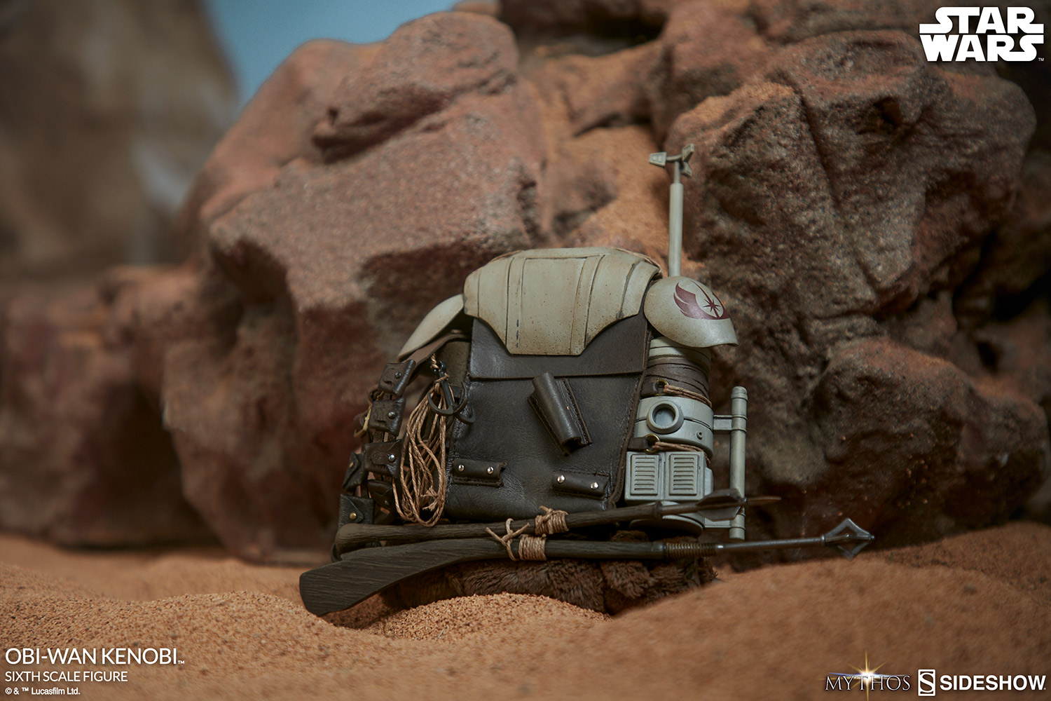 The Obi-Wan Kenobi Sixth Scale Figure comes equipped with a modified Tusken rifle and 2 gaffi sticks, and technology necessary for survival such as a portable moisture vaporator, a grappling hook, a droid caller, and macrobinoculars. Obi-Wan also has goggles and Clone Wars armor as remnants of his noble past.