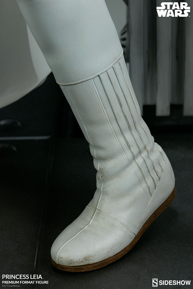Princess Leia wears a custom tailored fabric costume, carefully styled after her famous white gown with a hood and a silver belt. The figure has a polystone body with sculpted boots, along with a PVC portrait and hands. Down to the sculpture of her fingertips, the Princess Leia Premium Format™ Figure is a tribute to this timeless character who has inspired an entire galaxy of Star Wars fans.
