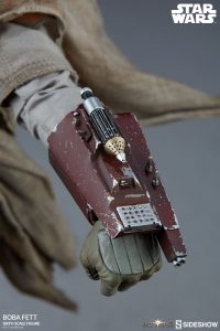 Every bounty hunter needs trophies to prove their skill- Boba Fett comes with three shoulder-mounted synthetic-hair Wookiee braids, and three unique lightsaber hilts taken from his fallen targets.