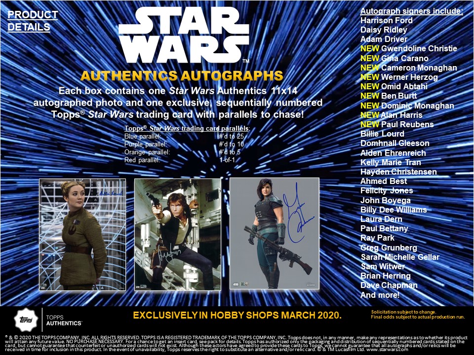 The Star Wars Authentics 11×14 Autographed Photo Blind Pack will be in hobby shops March 2020!