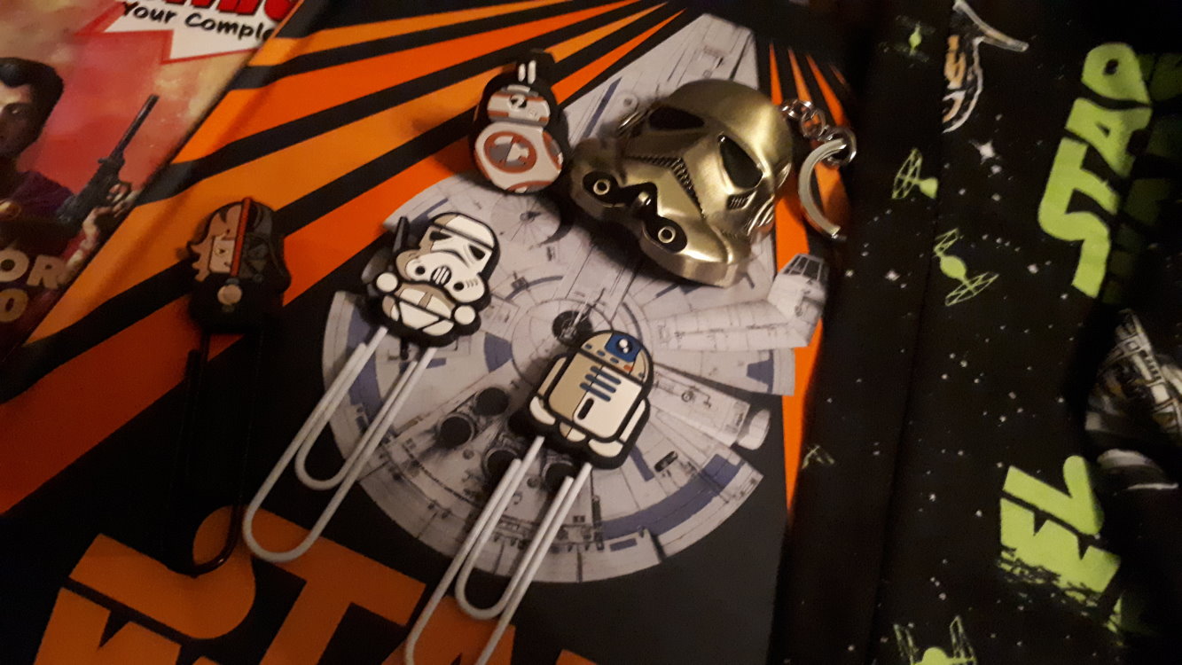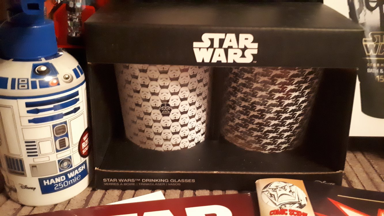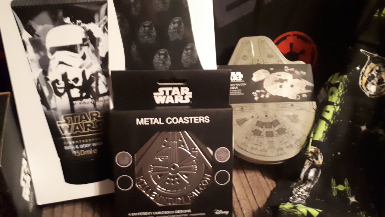 There was a set of Bath & Body Wash and Socks (what are people trying to tell me?) some metal coasters, a Rogue One era desk tidy set, a Firefly R2-D2 handwash with sound chip, a Stormtrooper keyring and a BB-8 car air freshener (smells like freedom)