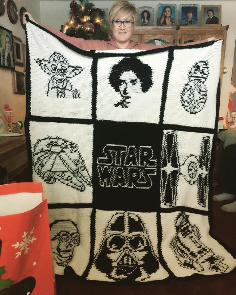 A Star Wars Homemade Christmas! The entire blanket is handmade by my mom (Jane Schmigiel) and the Leia image is her own sketched pattern since she couldn’t find one.