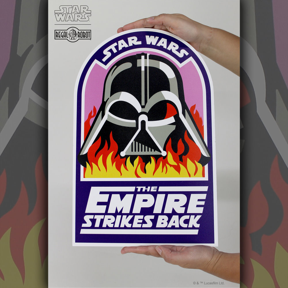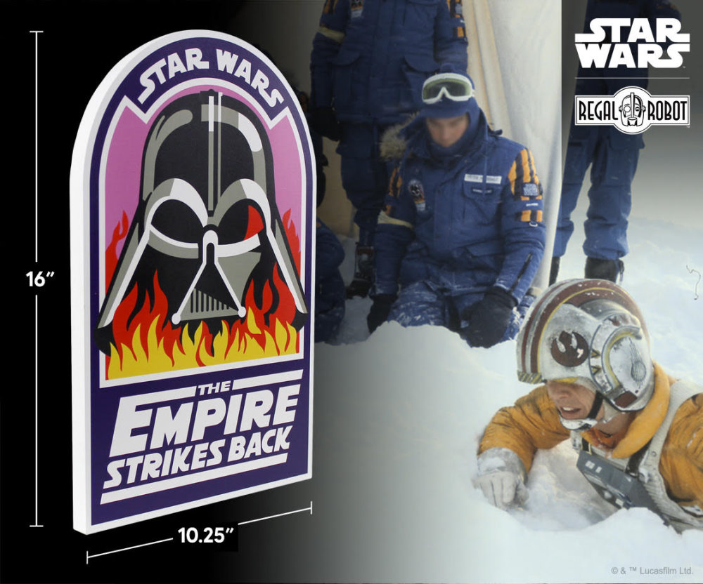 Celebrating the 40th anniversary of The Empire Strikes Back, Regal Robot reveal their new wood art plaques., kicking of with the classic Ralph McQuarrie Vader In Flames crew patch art and the Wampa warning sign plaque, from the cut scene on Hoth where Threepio rips off the sign and snowtroopers enter to their peril.