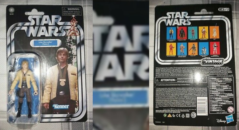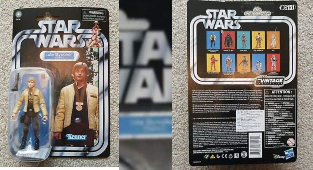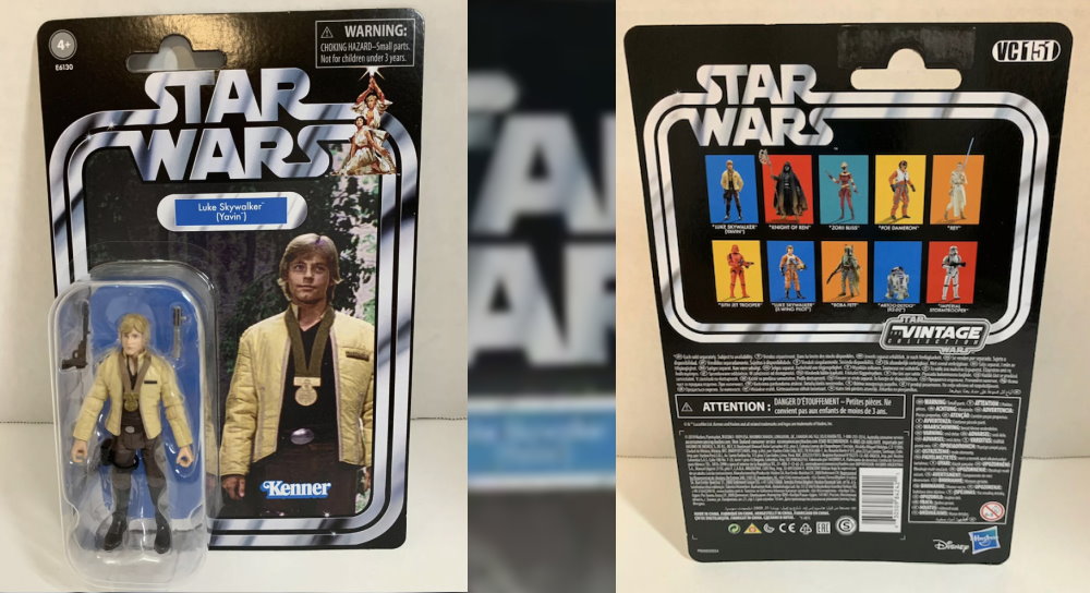 There have been three variants on the VC151 Luke Skywalker Yavin figure found, with different PN numbers on the card and the first release not having the warning leaflet in the bottom of the bubble and the text on the back of the cards changing the position of the “ATTENTION” box from being in the middle of the text on the left to being above the warnings box on the right.