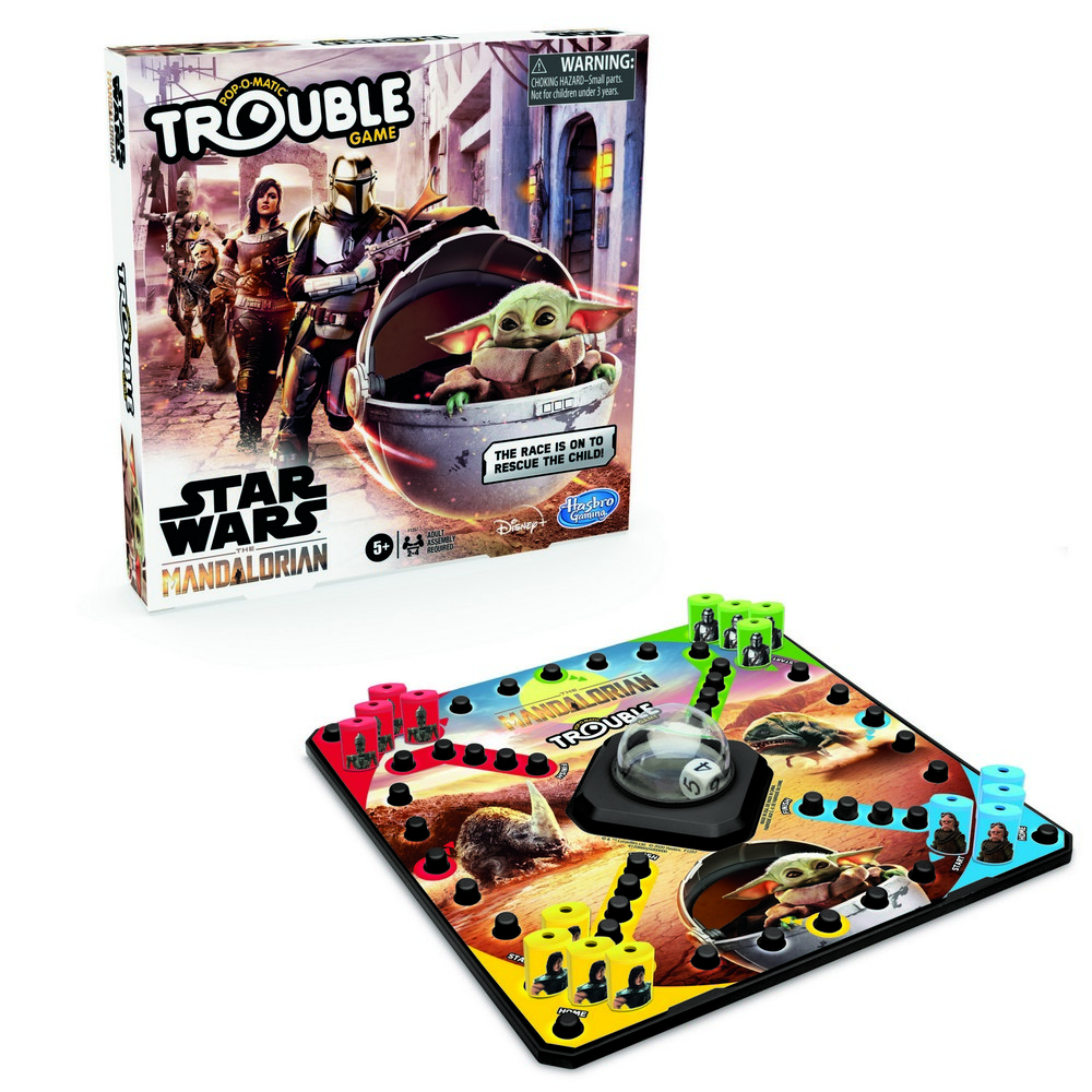 Inspired by the THE MANDALORIAN live-action TV series on Disney Plus, this TROUBLE: STAR WARS THE MANDALORIAN EDITION Game combines TROUBLE gameplay with THE MANDALORIAN adventures. Race around a dangerous planet in the outer reaches of the galaxy to rescue THE CHILD, who fans call “BABY YODA”. Choose to play as bounty hunter, THE MANDALORIAN, IG-II the droid, the skilled warrior, CARA DUNE, or the vapor farmer, KUILL. The first player to get all 4 of their pawns to the Home space to rescue THE CHILD wins! This game makes a fun choice for Family Game Night and it’s a great gift for STAR WARS THE MANDALORIAN fans. This game is for 2 to 4 players. Includes plastic game unit base with Pop-O-Matic die roller, cardboard gameboard insert, 16 plastic character pawns (4 of each color), label sheet, and instructions. Available at Amazon and Walmart.