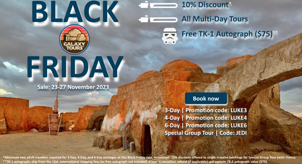 Black Friday sale. Save money on the Star Wars adventure of a lifetime in Tunisia with 10% off all Twin Suns Expedition packages. Sale lasts through Cyber Monday. Promotion code required. This is the gift you’re looking for!