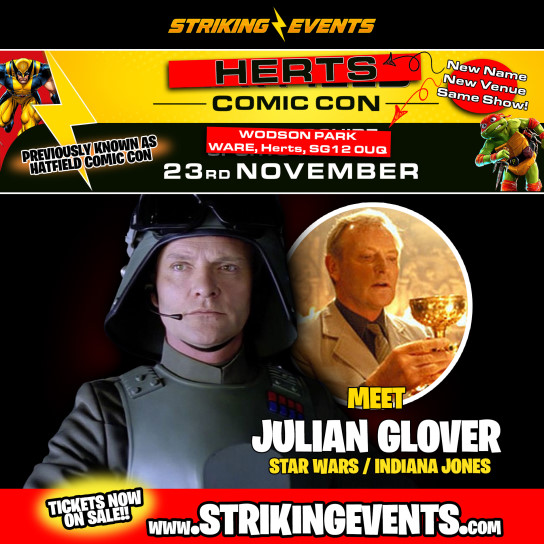 Herts Comic Con bring news of their next guest, and this time it’s a star from The Empire Strikes Back and Indiana Jones and the Last Crusade. Julian Glover will be coming to The Wodson Park Leisure Centre, Ware on Sunday 23rd November for autographs, onstage conversation, and a photoshoot that can be booked by clicking here. Julian joins the previously announced Temuera Morrison, Guy Henry, Garrick Hagon and Dermot Crowley at the show.