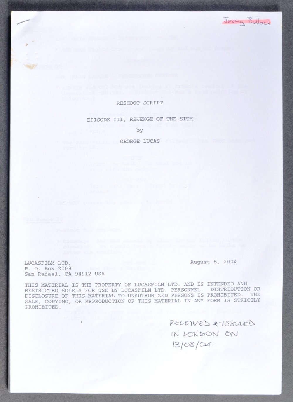 Bulloch’s Script From Revenge Of The Sith (£1,500 to £2,500): Bulloch was invited back to the franchise in the prequel trilogy for a small cameo role of Captain Colton. The script is his personal reshoot script for his scene (and a few surrounding scenes) and features his lines. He was allowed to keep this after filming, and it features his name to the front cover.