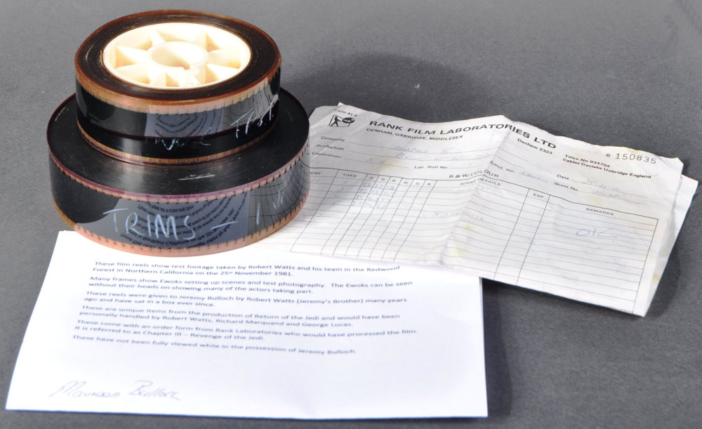 Unseen Return Of The Jedi Footage (£3,000 to £5,000): Bulloch’s half-brother was Star Wars producer Robert Watts. Watts shot the footage in November 1981 in North Carolina, and it shows early Ewok test footage. It is believed to be unseen ‘newly discovered’ footage. At some point Watts gifted the two reels to Bulloch and they remained in his safe storage for many years, unseen.