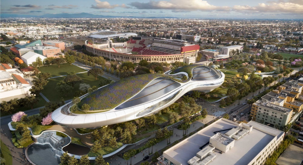 MAD Architects, is designing the five-story, approximately 300,000-square-foot building, while Stantec is serving as executive architect. The Lucas Museum has a steel frame, clad in 1,500 glass fiber reinforced polymer panels, and a rooftop composed of greenery and solar panels.