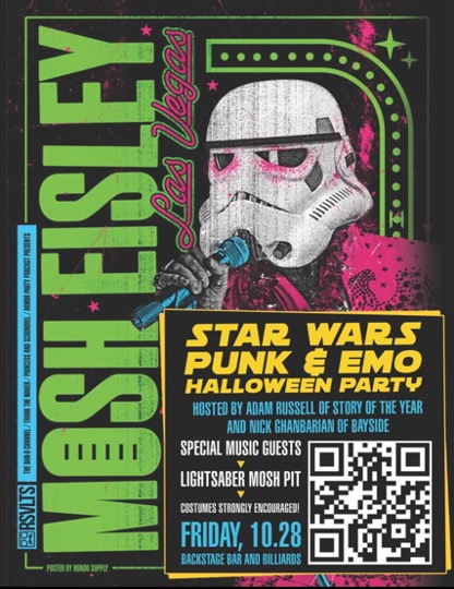 Perhaps a bunch of other Star Wars-related antics will ensue, but RSVLTS will be a part of the upcoming MOSH EISLEY party (10/28 in Las Vegas), we’ll have some merch available at the booth and some other giveaways, and the crew (DTH, Shriner, Scotty, David, etc.) will be there rocking and dancing deep into the night.