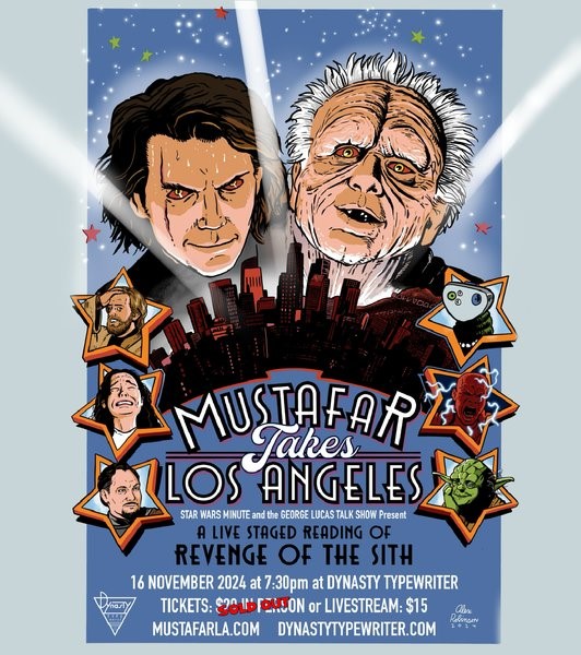 We’re celebrating the prequel trilogy in 2024, and Patrick Cotnoir (ASSSSCAT Producer + Booker, The George Lucas Talk Show Executive Producer + Booker, Exactly Right Guest Booker, Natalie Morales and the Night Crew Producer) brings us news of the third very special event – Mustafar Takes Los Angeles: A Live Reading of Revenge of the Sith – which will  be live streamed as the show is a complete sell-out at Dynasty Typewriter on Wilshire Boulevard in LA.
