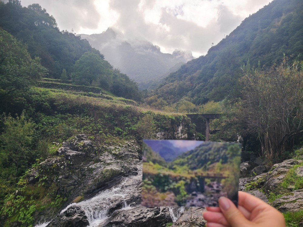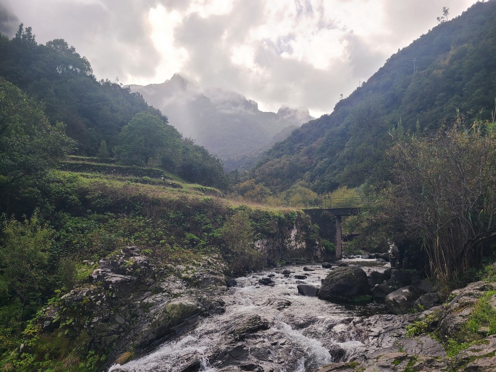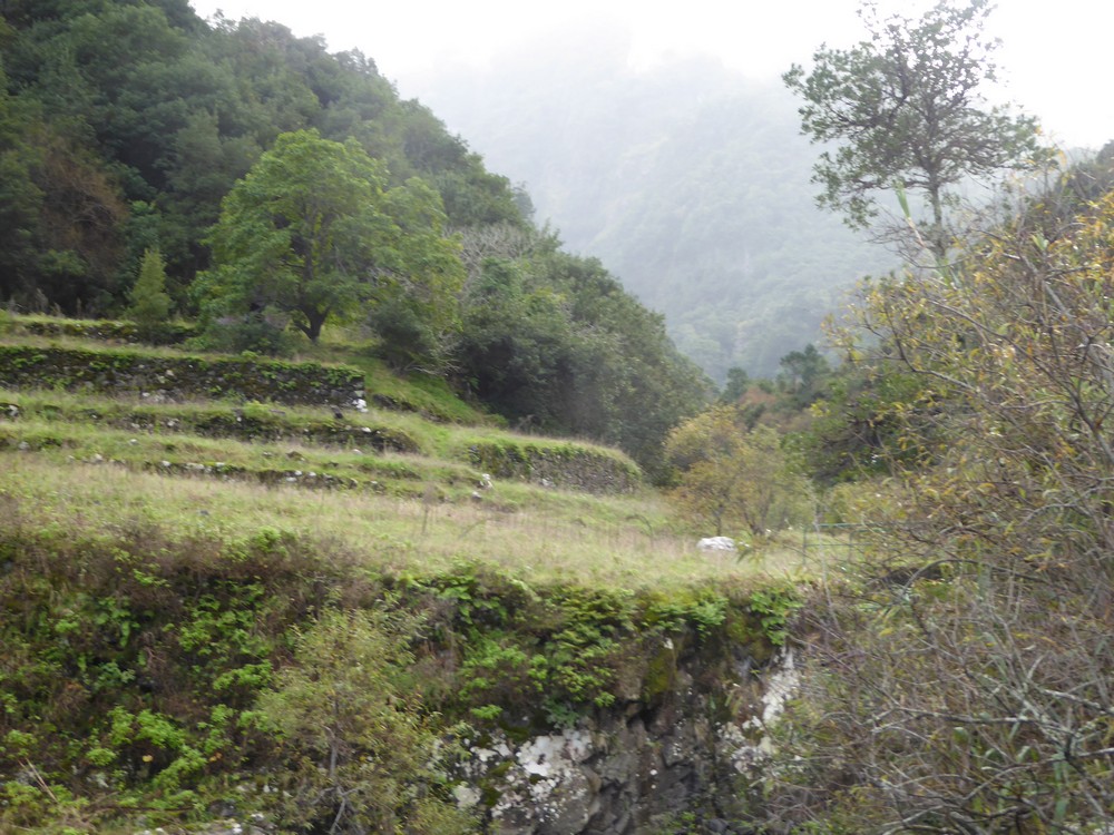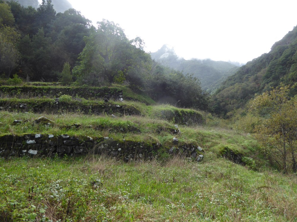 Continue on, and you’ll pass an abandoned vineyard on the downhill side. At the end of the vineyard is a stone stairway down the terraces. Before you reach the final terrace, the trail turns north, cutting between the vineyard terraces before turning to the stream and the bridge. Cross the bridge and you’re at the abandoned terraces where the ship landed and the pair unpacked their gear. The mountains up the valley are pretty easy to line up, even with a little cloud cover. If you want to reach the namesake pool of Poço das Casas, then instead of crossing the bridge, continue north on the trail along the stream maybe another 100 feet. I foolishly forgot to check this romantic spot out.