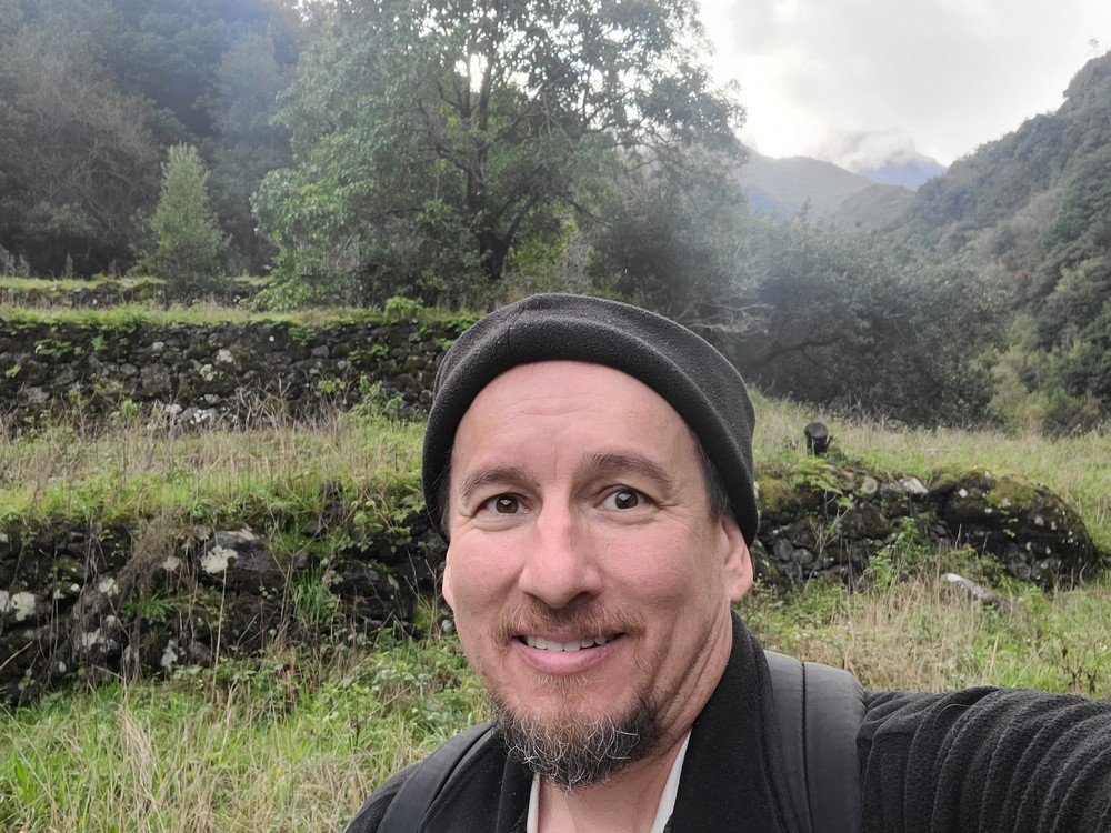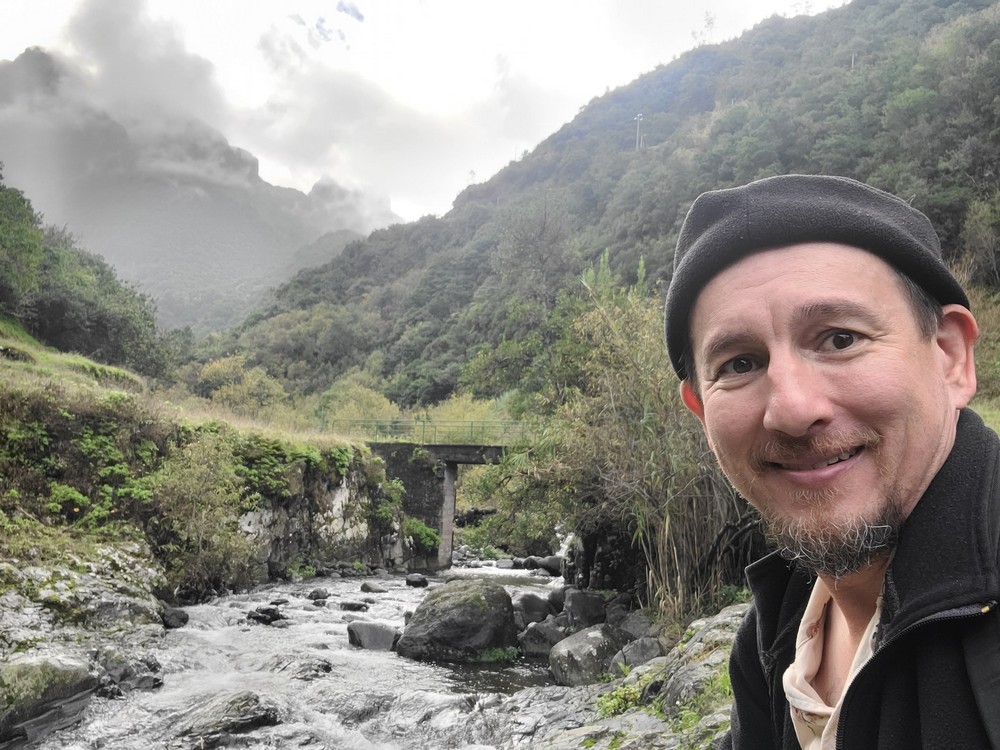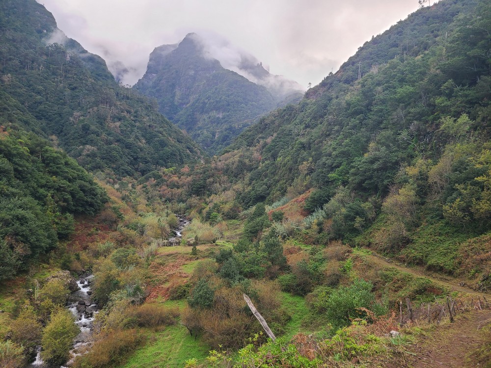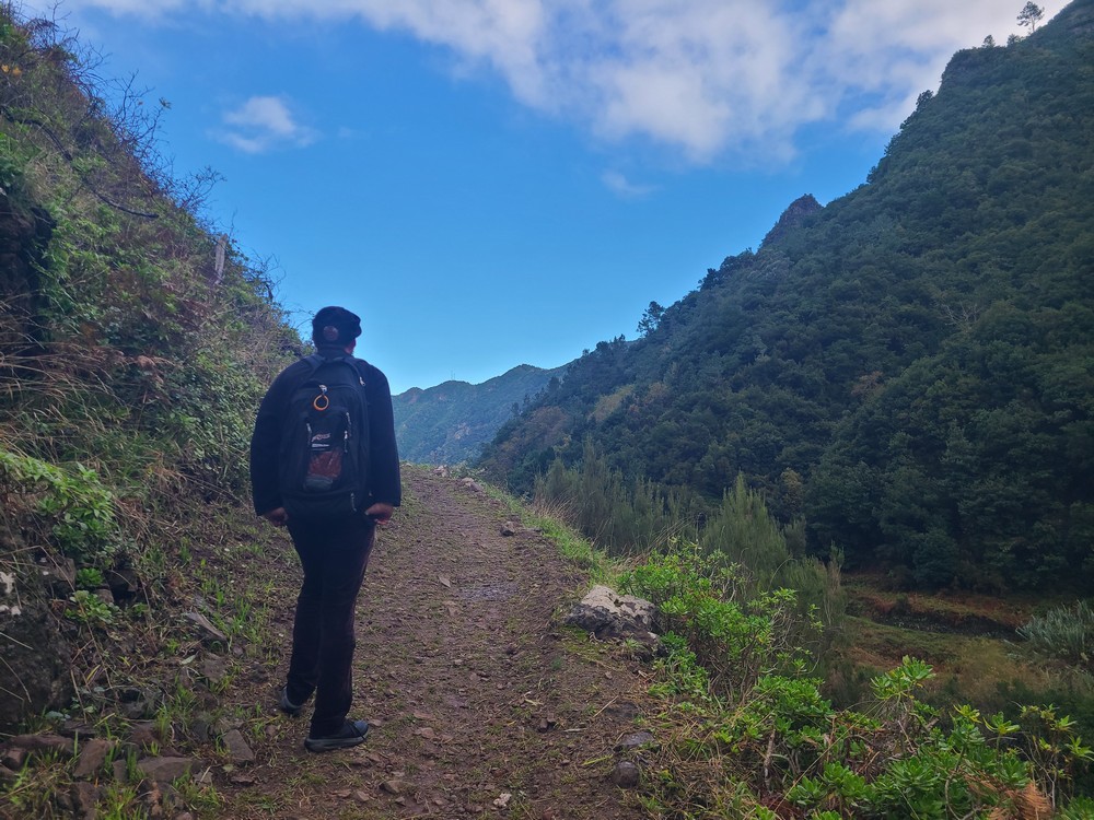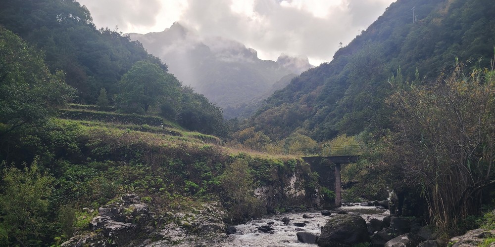 Continue on, and you’ll pass an abandoned vineyard on the downhill side. At the end of the vineyard is a stone stairway down the terraces. Before you reach the final terrace, the trail turns north, cutting between the vineyard terraces before turning to the stream and the bridge. Cross the bridge and you’re at the abandoned terraces where the ship landed and the pair unpacked their gear. The mountains up the valley are pretty easy to line up, even with a little cloud cover. If you want to reach the namesake pool of Poço das Casas, then instead of crossing the bridge, continue north on the trail along the stream maybe another 100 feet. I foolishly forgot to check this romantic spot out.