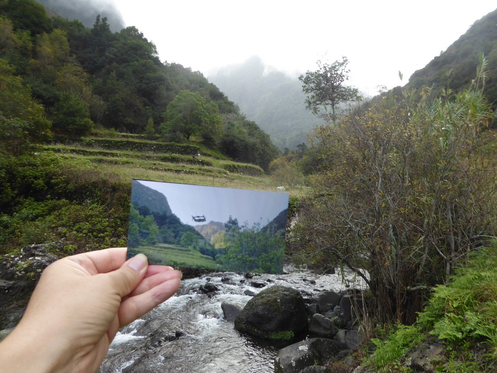 A view to the north should have revealed rockier, more barren ridges with a distinctive silhouette, used in another shot, but instead of clouds floating below these peaks, I had nothing but white. At least I had my rubber duck yellow rain jacket to keep me dry while I fished out my photo prints to try to line up shots in the rain. Later in that episode, there are several shots of the setting sun over layer of clouds with flattened treetops poking through. These were filmed facing west, likely from the back deck of the gift shop, into the deep Curral das Freiras (Valley of the Nuns). While I could begin to line up the slope on the right of the pictures, the dense fog blocked any real view. Next time, I guess. Still, hikers paid no attention to the drizzle as they set off on the mountain trails. Of course, after we started down the mountain, we descended through the cloud layer and had a clear view all the way down to the cruise ships in Funchal.
