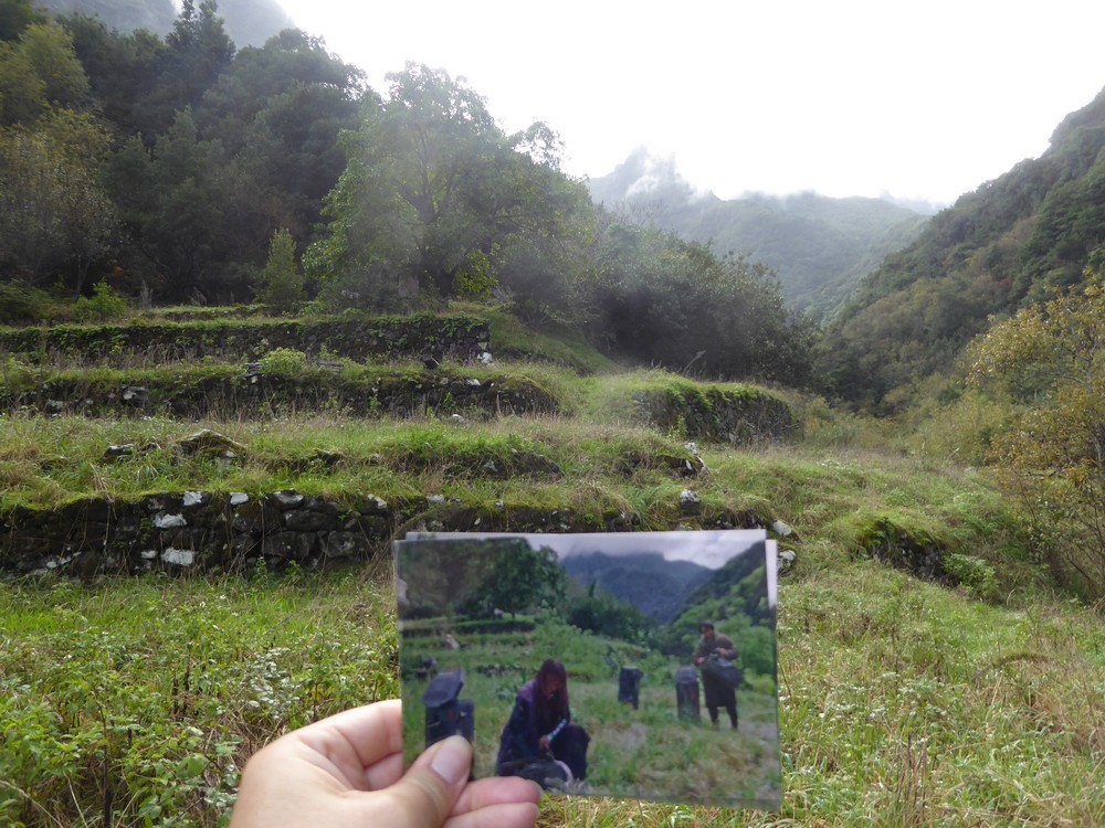 Without the cable system for us, we had to find that pedestrian access point. Through trial and error, we discovered it was tucked in at the last set of houses along the road (see sidebar). We walked down the road between the homes and it petered out into a trail past an abandoned home and some goats. Reaching a spot where I could see the bridge and the terrace across the stream, I cut off alone and with some false starts, found the pedestrian bridge and crossed over. The grass was a bit taller than when filmed, but lining up the stone walls holding up the terraces as well as the mountain outlines up the valley easily confirmed the location. I took my photos, recorded some video in the rain, and was ready to find the spot where Qimir and Mae are on a hiking trail toward Kelnacca’s forest. I figured that it was up the trail past the bridge cutoff and went back to the west side of the stream.
