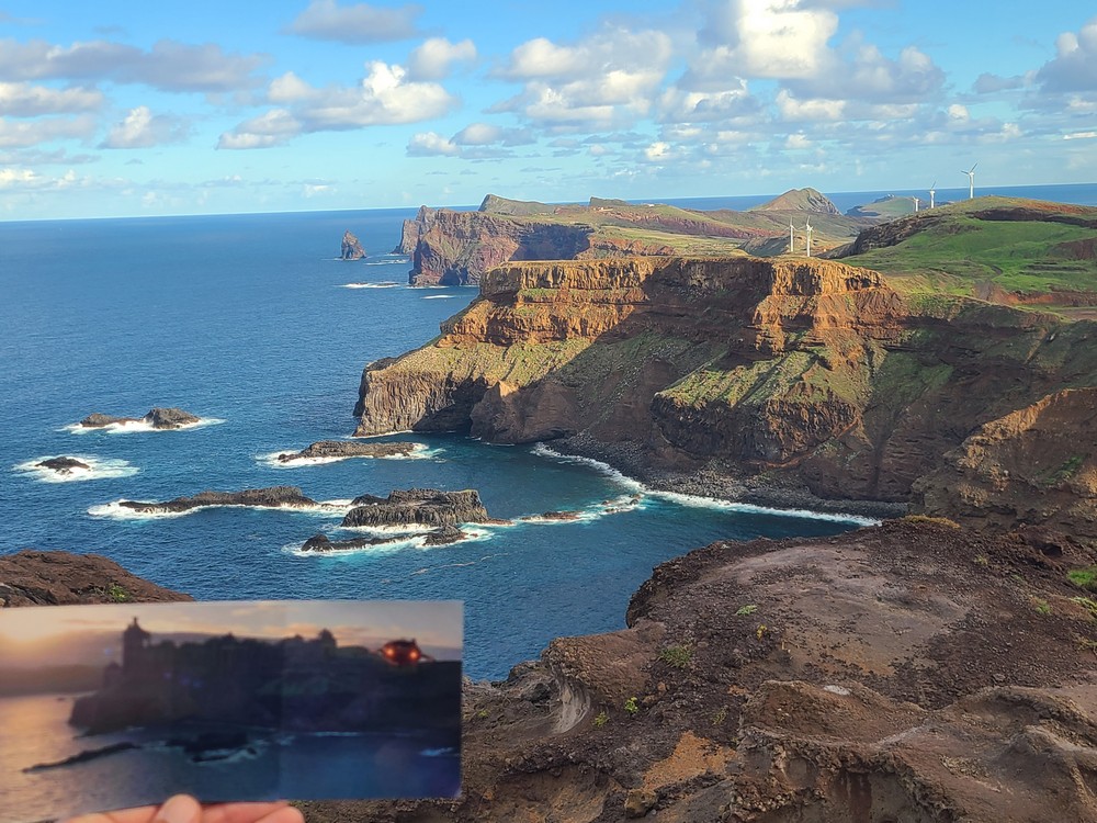 Back on the road, we headed east to Caniçal, the easternmost and geologically oldest part of the island, and home to the final two planets of our Madeira Star Wars adventure. First up was the Calhau da Forna do Bode. The cliffside city on Olega, with its Jedi outpost, had been digitally added to the flat-topped Ponta do Bode peninsula for several shots in both day and night conditions for “Revenge / Justice,” The Acolyte’s second episode. The lookout point, or miradouro (literally “golden sight”), where they filmed from, was somewhere on a cliff facing east to Ponta do Bode. After trying some off-road forest action to see if we could get closer to the viewpoint, we swung back and parked at the Caniçal cemetery.
