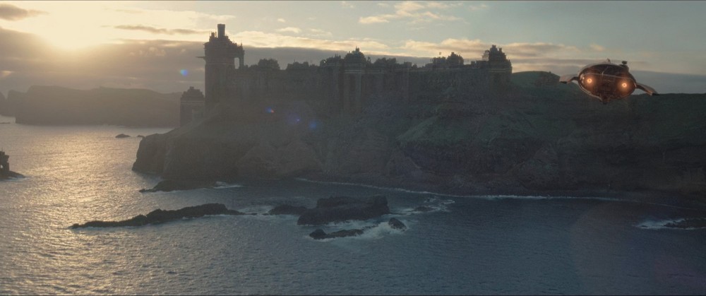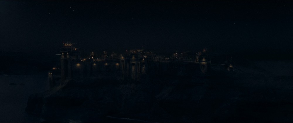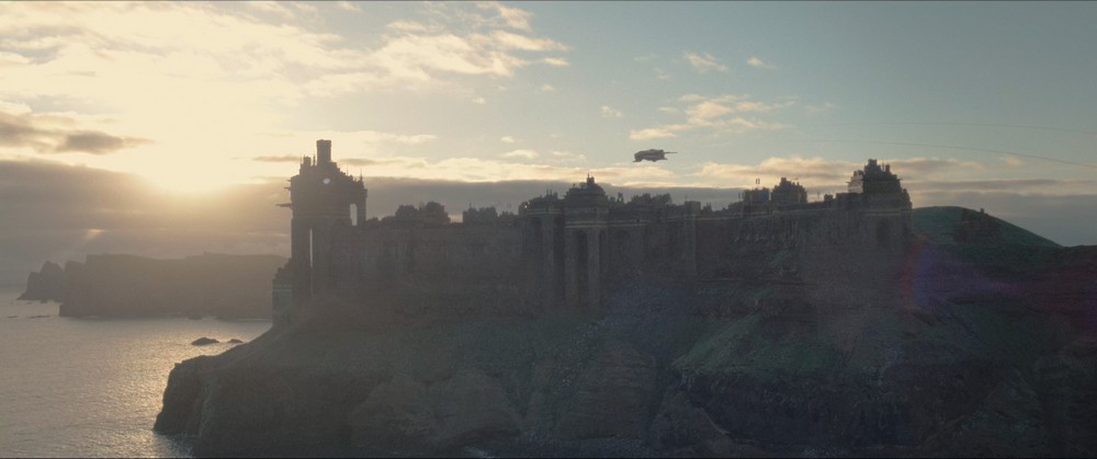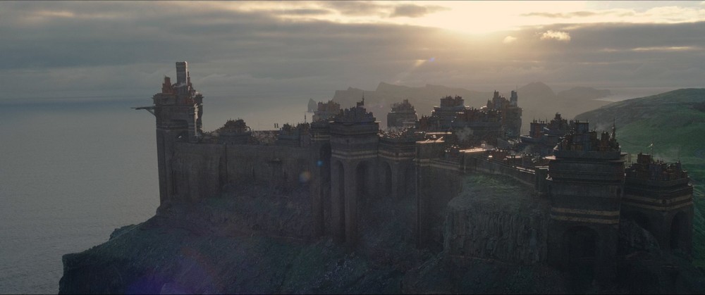 Heading eastward still, we passed through the industrial port at Caniçal and then a fancy resort before hitting the end of the road, the trailhead to the eastern edge of Madeira, the rugged treeless peninsula of Ponta de São Lourenço. This spot is where Mae stands as she faces the hilltop settlement on Ueda across a small bay from her vantage point at the beginning of the first episode of The Acolyte, “Lost / Found”. This spot was also used for some promo materials for the show as well. In becoming Ueda, the scale of this landscape was drastically changed. Instead of a natural human scale where the mountain would dwarf any human settlement on it, the town’s buildings loom huge. The fish farms in the bay were digitally removed and a stone path across the water was added, connecting to a trail up to the town arch. The island on the right side was removed, and replaced with two top-heavy stone towers, but a tiny sea arch on the main rock remains.