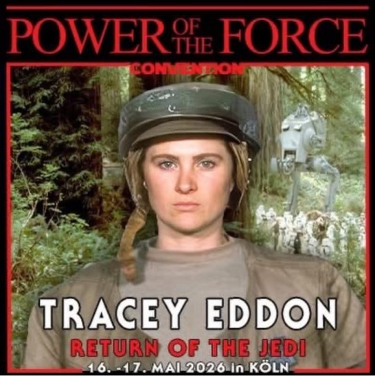 Power of the Force convention returns to Cologne over the weekend of 16th and 17th May 2026, and signing autographs, posing for photographs and discussing her roles in Return of the Jedi is Tracey Eddon. In the meantime you can read our reviews of the 2024 and 2025 events, and great news; Fantha Tracks will once again be there – this time in force – so we’ll see you in Germany.