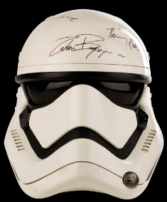 An original Star Wars: The Force Awakens screen used Stormtrooper helmet signed by Harrison Ford, Carrie Fisher, Mark Hamill, Daisy Ridley and other lead cast members of the film, estimated to sell for $80,000 – $120,000.