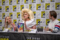 After her spectacular debut at the Her Universe Fashion Show, Nina had a special panel, the following day hosted by her friend Ashley Eckstein. Ashley arrived at the panel in a special sweatsuit with the words HYPE FRIEND across the shirt and rainbow sleeves on the sides of the top and bottoms. She also wore an amazing rainbow hair extension.