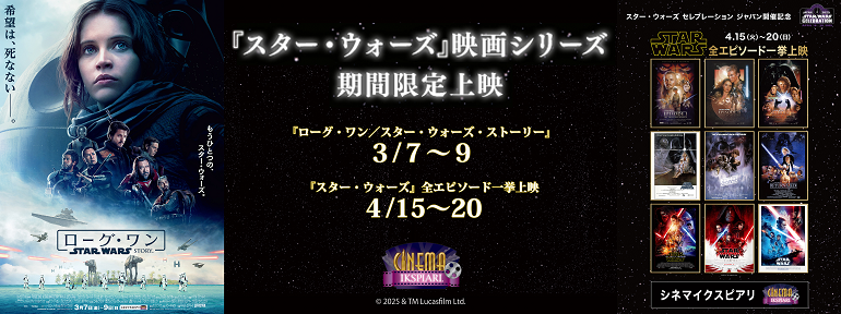 Cinema Ikspiari, a movie theater located in the Ikspiari commercial facility in front of Maihama Station, will be screening the film Rogue One: A Star Wars Story, in which Cassian Andor appears, from March 7th (Friday) to March 9th (Sunday) in advance of the special version of Star Tours: The Adventures Continue , which will be held from April 8th (Tuesday). From April 15th (Tuesday) to April 20th (Sunday), all nine films in the Star Wars film series, Episodes 1 to 9, will be screened at once.