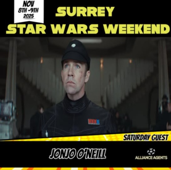 Smugglers Surrey Star Wars Weekend take place over the weekend of Saturday 8th and Sunday 9th November 2025, and visitors to the Weybridge Campus of Brooklands Technical College on Heath Road, Weybridge will have the chance to meet a Troop transporter of Imperial officers and rebel heroes. Added to the guestlist is Jonjo O’Neill (Captain Kaido in Andor season 2), who joins Alistair Mackenzie (Perrin Fertha in Andor), Pierro Niel-Mee (Erskin Semaj in Andor), Jacob James Beswick (ISB Agent Heert in Andor), Nick Owenford (ISB Supervisor), Michael Jenn (Supervisor Lagret), Jonathan Rhodes (Reporter #1), Anton Lesser (Major Partagaz in Andor seasons 1 and 2), Robert Emms (Lonni Yung in Andor), Wilf Scolding (Vanis Tigo in Andor season 1) and Louis Martin (Sergeant Benz in Andor season 2) on the Saturday.