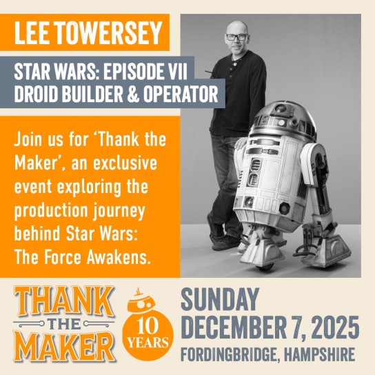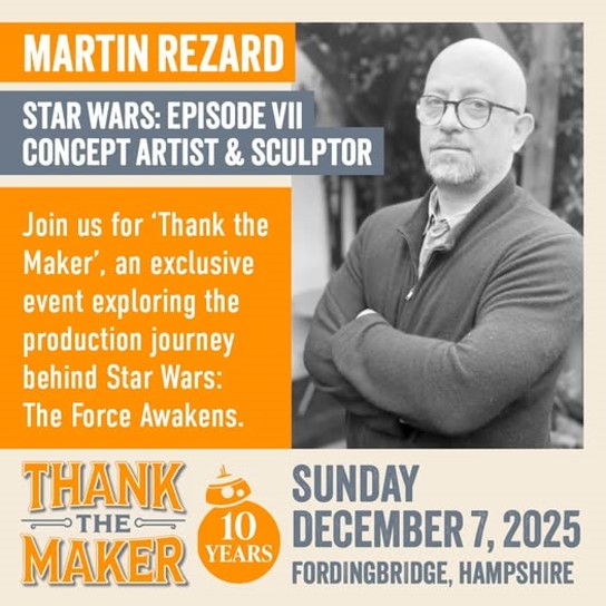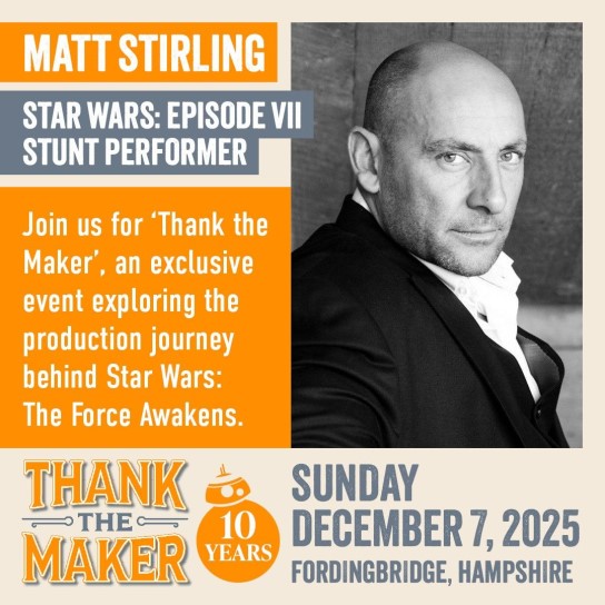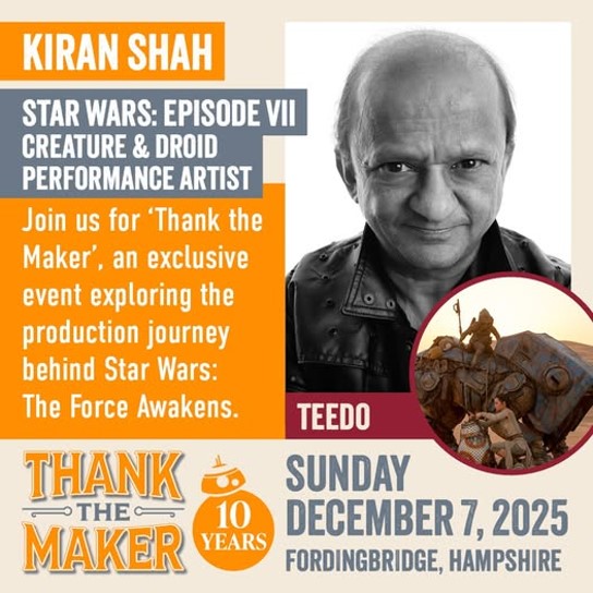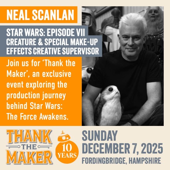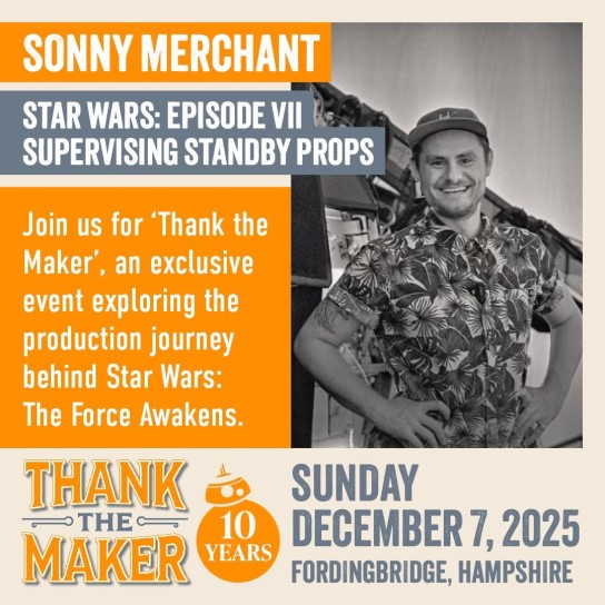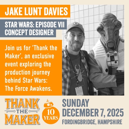 This weekend, Thank The Maker will celebrate a decade of The Force Awakens, bringing the talents behind Episode VII to Fordingbridge to delve into the creation of one of the highest grossing films of all time. Sonny Merchant, Matt Stirling, Katy Coleman, Kiran Shah, Neal Scanlan, Oliver Steeples, Jake Lunt Davies, Brian Herring, Martin Rezard and Lee Towersey are at the show, along with very special guest moderator Pablo Hidalgo.