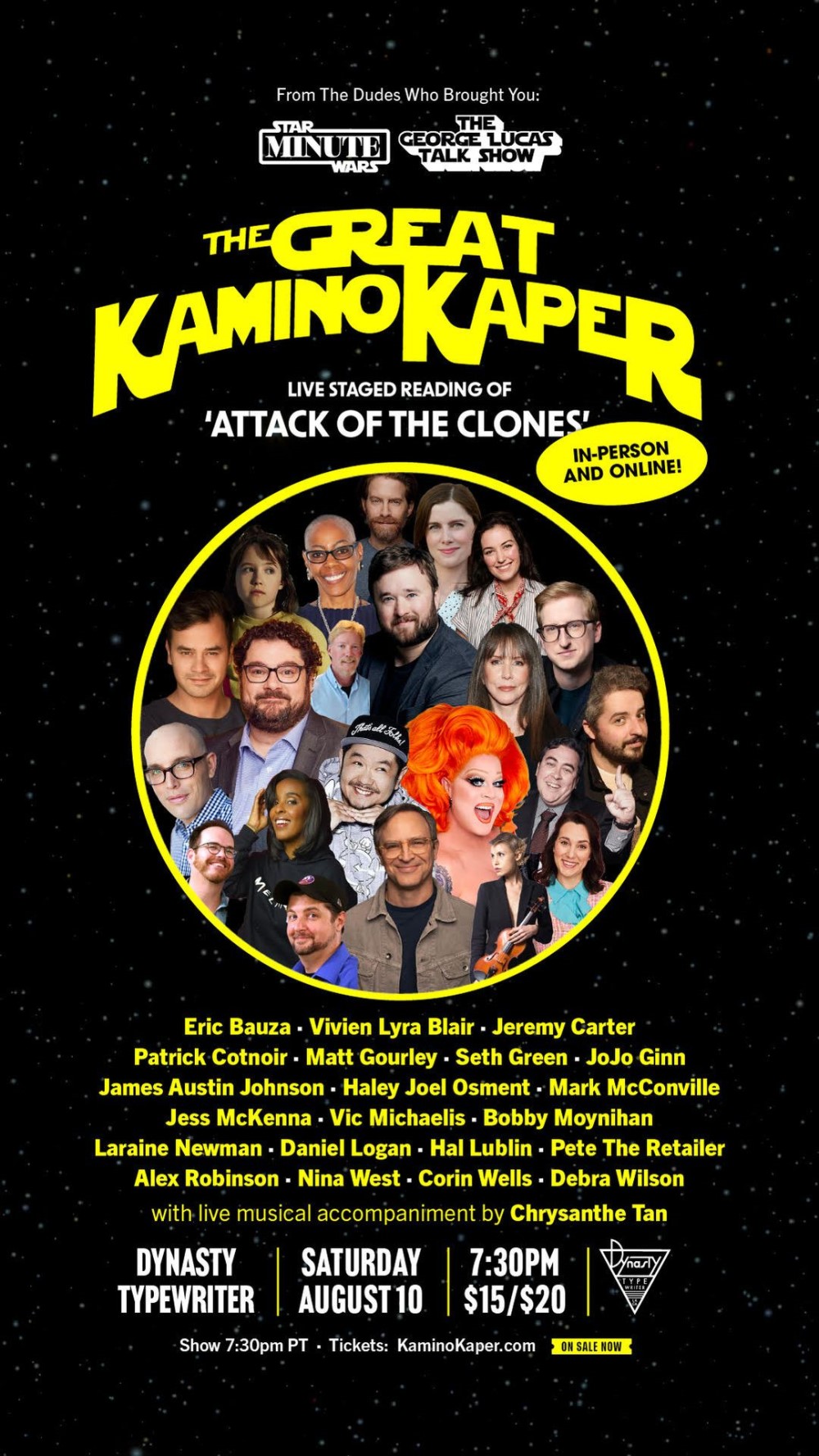 We’re celebrating the prequel trilogy in 2024, and Patrick Cotnoir (ASSSSCAT Producer + Booker, The George Lucas Talk Show Executive Producer + Booker, Exactly Right Guest Booker, Natalie Morales and the Night Crew Producer) brings us news of another very special event – The Great Kamino Caper: A Live Reading of Attack of the Clones – which will also be live streamed for those unable to make it to Los Angeles and Dynasty Typewriter on Wilshire Boulevard in LA.