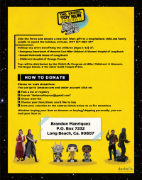 This year we hope to raise even more than last year. We realize all of our Star Wars friends and donators come from various walks of life and some of us have a lot, and some of us, not so much. Every kid loves a really rad Star Wars toy, however, some kids could just use a Star Wars coloring book or a Star Wars children’s book to help them escape into their imaginations for a little bit of Star Wars fun. In this situation, no Star Wars toy is too big or too small. Do what you can even if its just helping us spread the word!