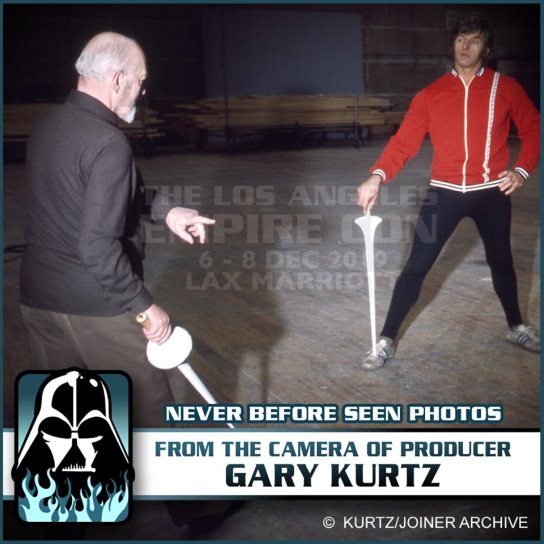 This image is one of many that will be on display at a special exhibit at #Empirecon’s inaugural year. It was taken by the late Gary Kurtz during one of the original rehearsals for the climactic showdown between Sir Alec Guinness (Obi-Wan Kenobi) and David Prowse (Darth Vader.)