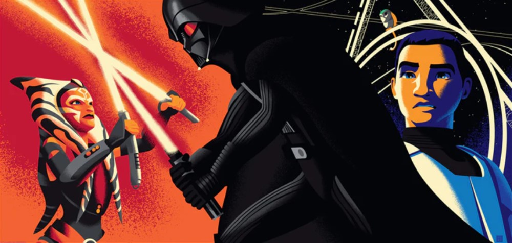 From the team at Dark Ink Art and artist Danny Haas this is World Between Worlds, limited to 395 hand-numbered lithographs for $60.00 and featuring a key moment from the second season of Star Wars Rebels featuring Ahsoka, Darth Vader and Ezra.