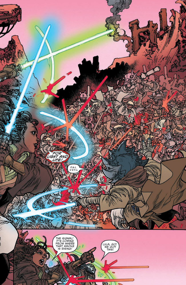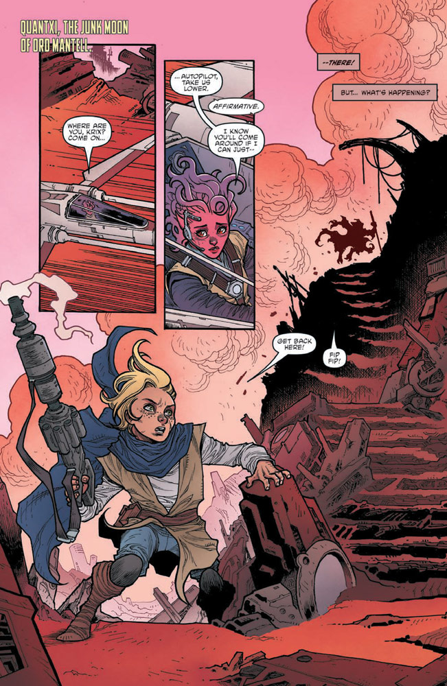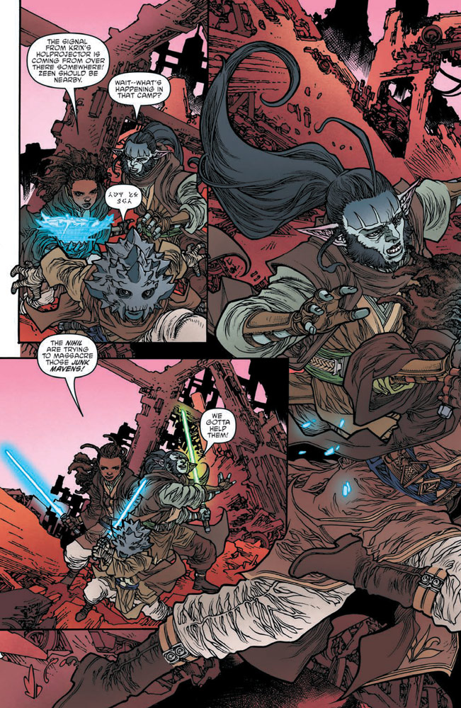 In StarWars.com’s exclusive preview of IDW Publishing’s Star Wars: The High Republic Adventures #5, Jedi Masters Yoda, Buckets of Blood, and Kantam Sy head to the junk moon of Quantxi to help their Padawans. But once again, the Nihil are waiting; meanwhile, Zeen seeks out her friend Krix, only to find a less-than-warm welcome…
