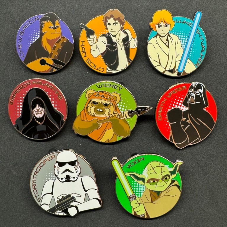 $19.99 will get you this Mystery Pin Set of two pins, giving you the chance to collect artwork drawn in the Galaxy of Adventures style at a number of locations including Pin Traders at EPCOT. The characters include Chewbacca, Han Solo, Luke Skywalker, Emperor Palpatine, Wicket, Darth Vader, Stormtrooper and Yoda.
