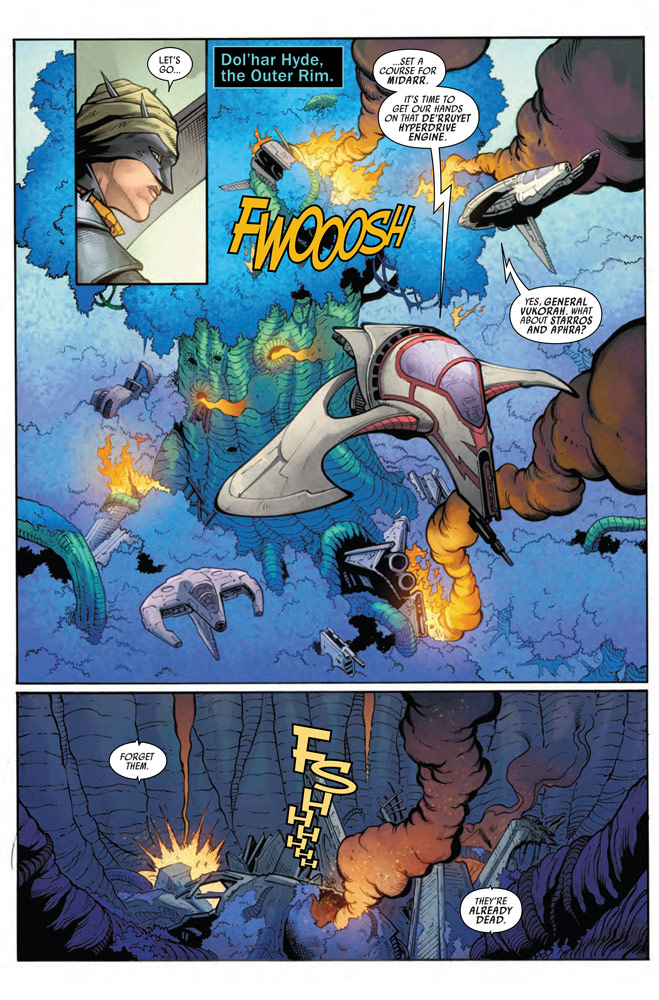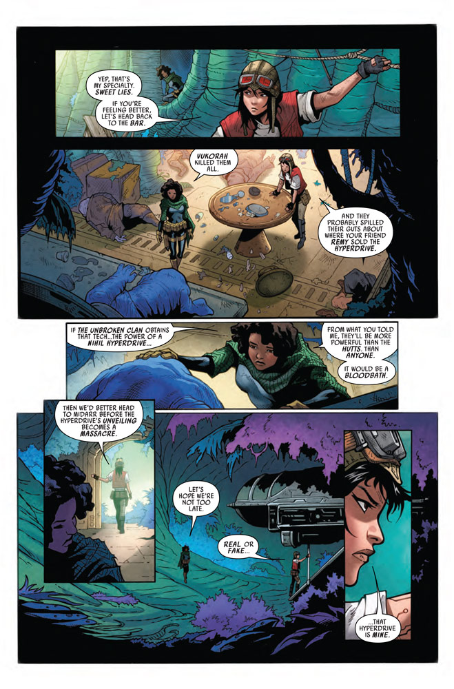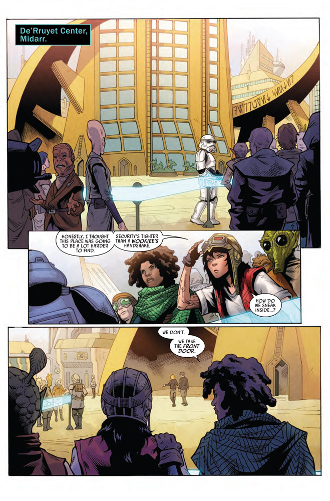 In StarWars.com’s latest exclusive first look at Marvel’s Doctor Aphra comic, we find the good doctor headed to Midarr to prevent the unveiling of the precious piece of ancient tech and the inevitable bloodbath that would ensue.