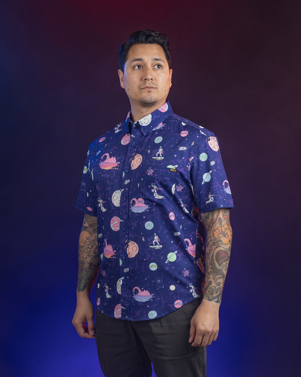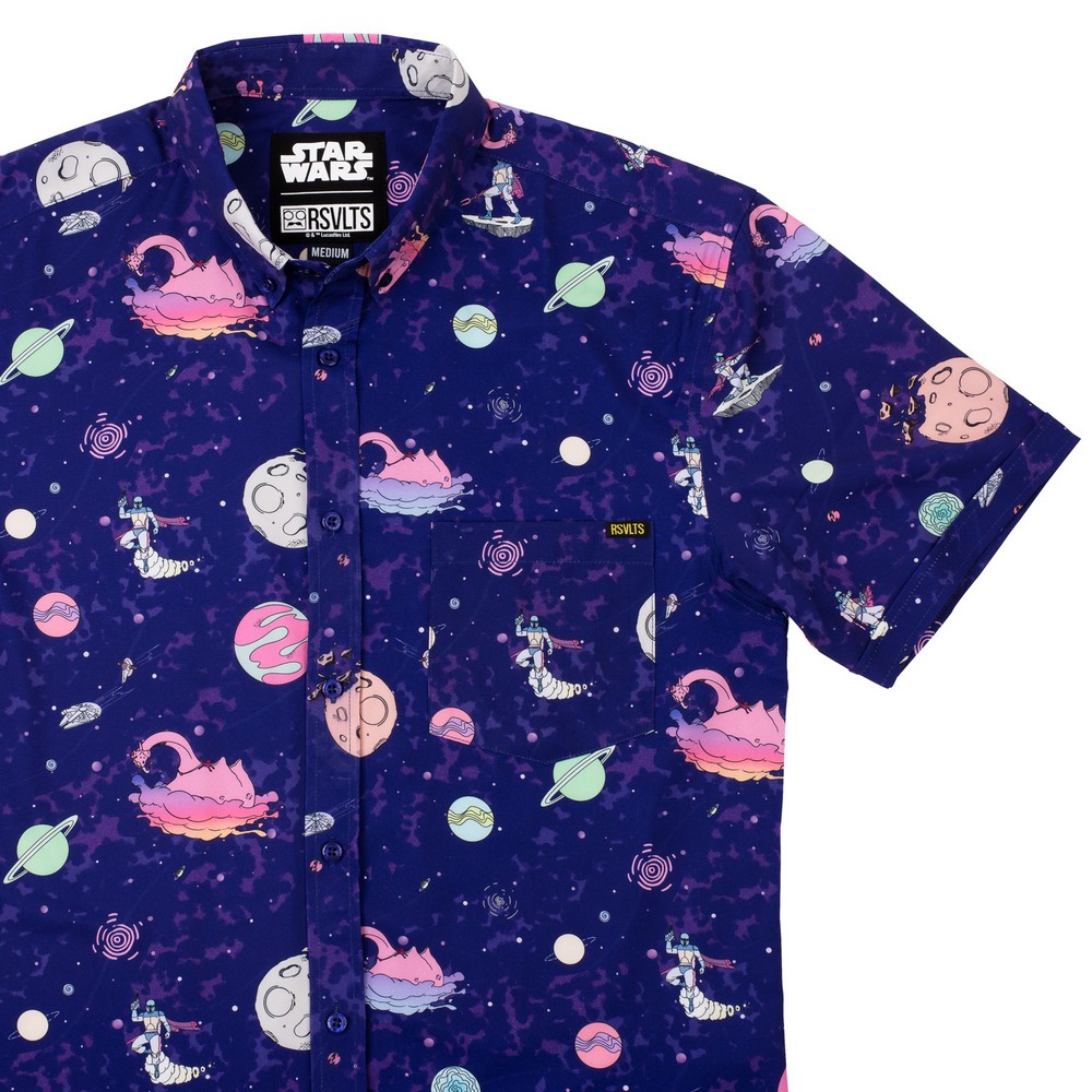 This special alternative colorway is a nod back to RSVLTS previous Boba’s Debut shirt of the same name, but this version – a dark and colorful, galactically retro shirt – is an homage to the world’s introduction to Boba Fett. Catch Boba flying around and battling a beast with his Amban sniper rifle all over this Kunuflex™ button-down.