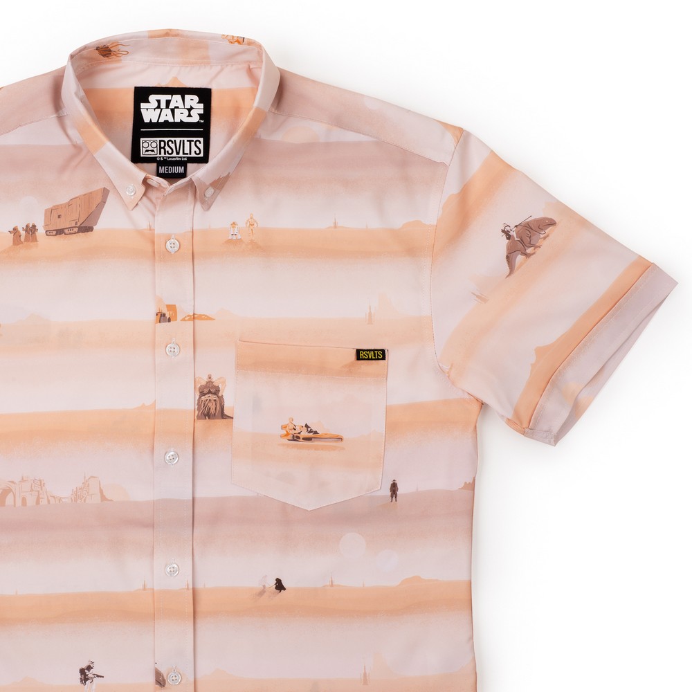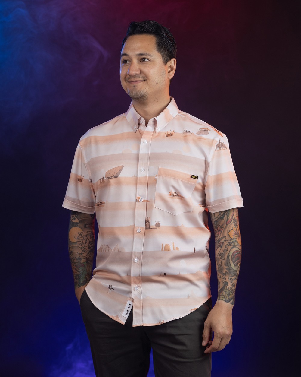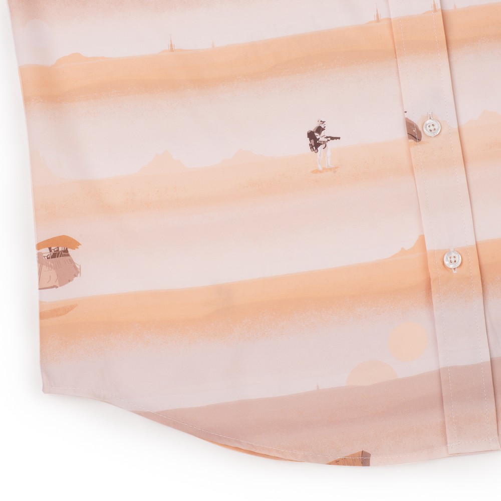 From C3PO wandering the desert to Jabba the Hutt’s attempt at feeding the sarlacc a few heroes for lunch, the sands of the two-sunned planet double as the sands of time on this bold yet understated Kunuflex™ button-down.