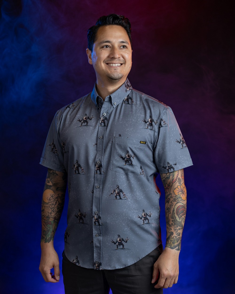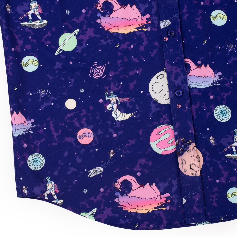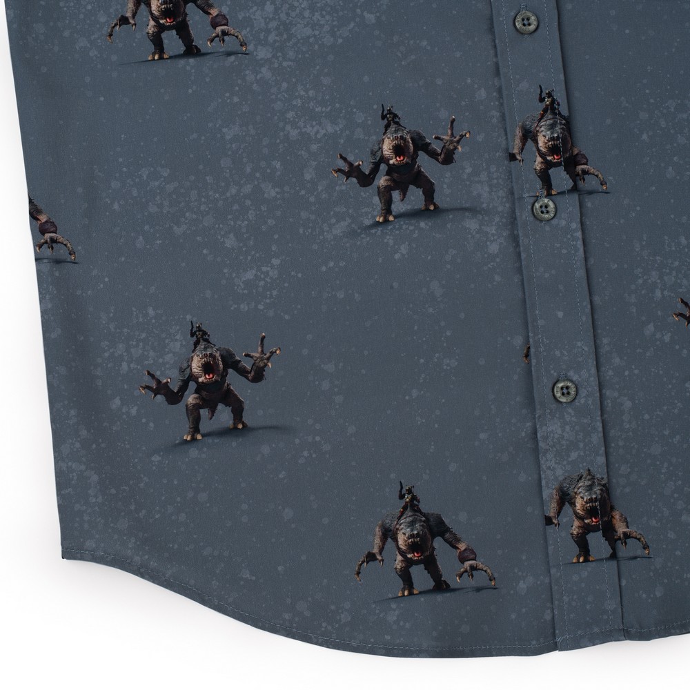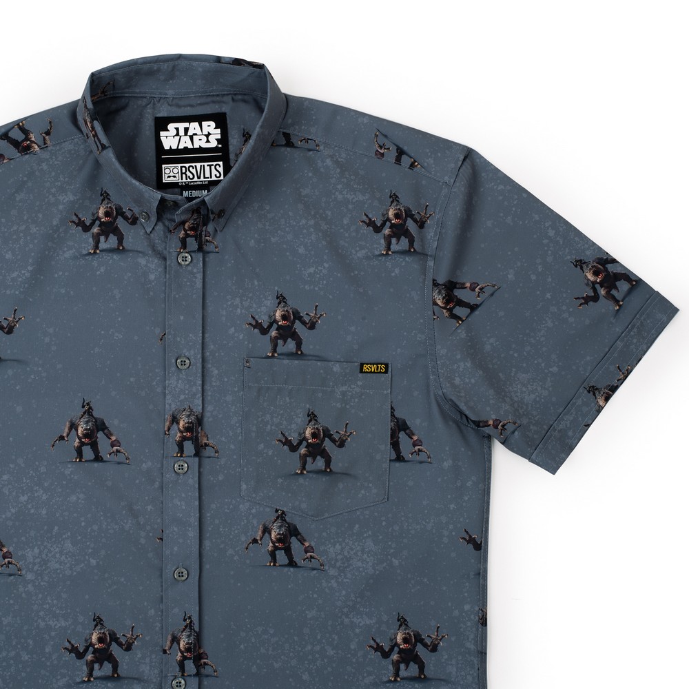 Take the blinders off and form a lasting bond with this Kunuflex™ button-down, which also features the galaxy’s newest duo of dominance by way of Mr. Fett riding his Rancor friend into battle.