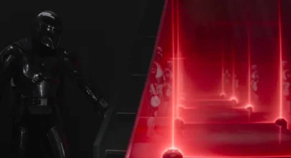 The Imperial Launch Bay, which features as a backdrop to Mando and Bo’s final duel with Moff Gideon, was shot utilizing ILM StageCraft. That environment was so massive there was no way to build it on a stage. But the benefit of shooting that in the volume was that all of the virtual architecture and lights reflected into the scenic floors, and that kind of connection really helps it feel seamless.