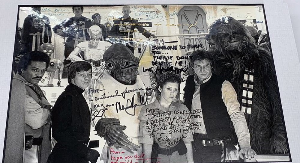 Personal photographs taken by a British woman who worked on the original Star Wars movies during breaks in filming include Han Solo actor Harrison Ford holding a sizeable fish he had just caught during a fishing trip and a group photo signed by the late Carrie Fisher.