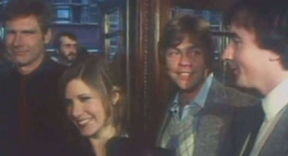 The clip shows Irvin Kershner, Gary Kurtz, Harrison Ford, Carrie Fisher, Mark Hamill, Billy Dee Williams and Anthony Daniels.