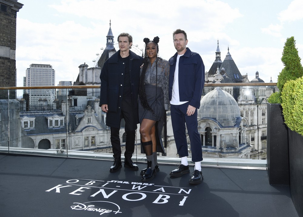 LONDON, ENGLAND – MAY 12: (L-R) Hayden Christensen, Moses Ingram and Ewan McGregor attend the photocall for the new Disney+ limited series “Obi Wan Kenobi” at the Corinthia Hotel on May 12, 2022 in London, England. (Photo by Gareth Cattermole/Getty Images for Disney) Obi-Wan Kenobi will be exclusively available on Disney+ from May 27.
