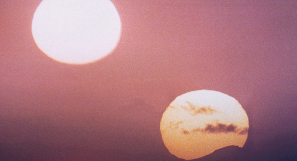 The shots that were attempted on March 22, however, are surprisingly different from those depicted in the final cut, newly revealed in continuity reports from the production. One view looked towards the igloo home, away from the setting sun, as Luke emerges. The white vaporator boxes are at the bottom of frame, and Luke stops near them, placing his hand on one as he gazes past the camera at the twin suns. An alternate, improvised take was then captured by Gil Taylor himself, the camera positioned behind Luke, towards the sunset, but with the character still in frame.