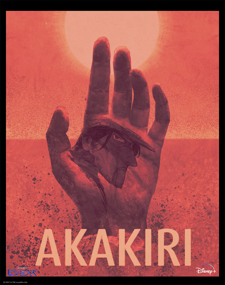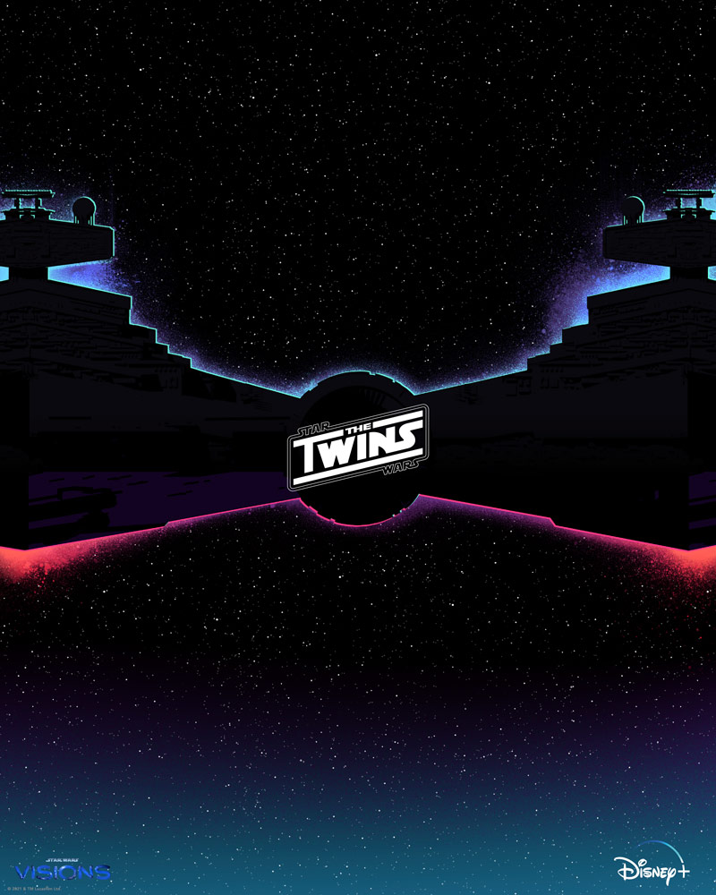 “Contrasting the colorful style of the episode, this silhouette of the Twin Star Destroyer on a starfield powerfully tells us the theme of the story. It is one of the most iconic Star Wars shots, and designer Shigeto Koyama pays a stylish homage to that.”