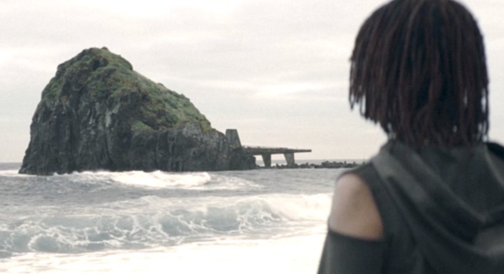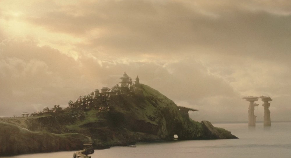 On 19th March 2024, Disney Plus released the trailer for The Acolyte as well as Key Art for the show. Among this Key Art was a poster that shows Mae standing on a cliff with a mountain and sea in the distance. This is at the exact same spot as this establishing shot, only without the digitally added town with the gate and the stone walkway.