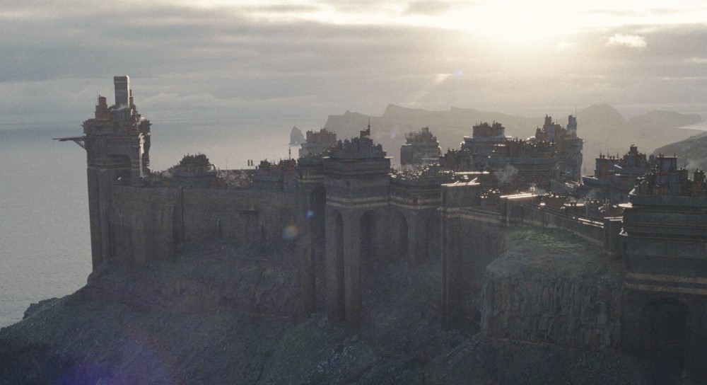 The first establishing shot shows Mae’s ship, the Eclipse II, with the cliff on which rests Olega City. While you would expect that the ship was digital, it was actually a three foot long miniature placed at the viewpoint. It was placed in the foreground of the shot at an angle to make it line up with the background. The background was then modified by ILM with adding a beacon tower in the sea and the city itself on the rock.