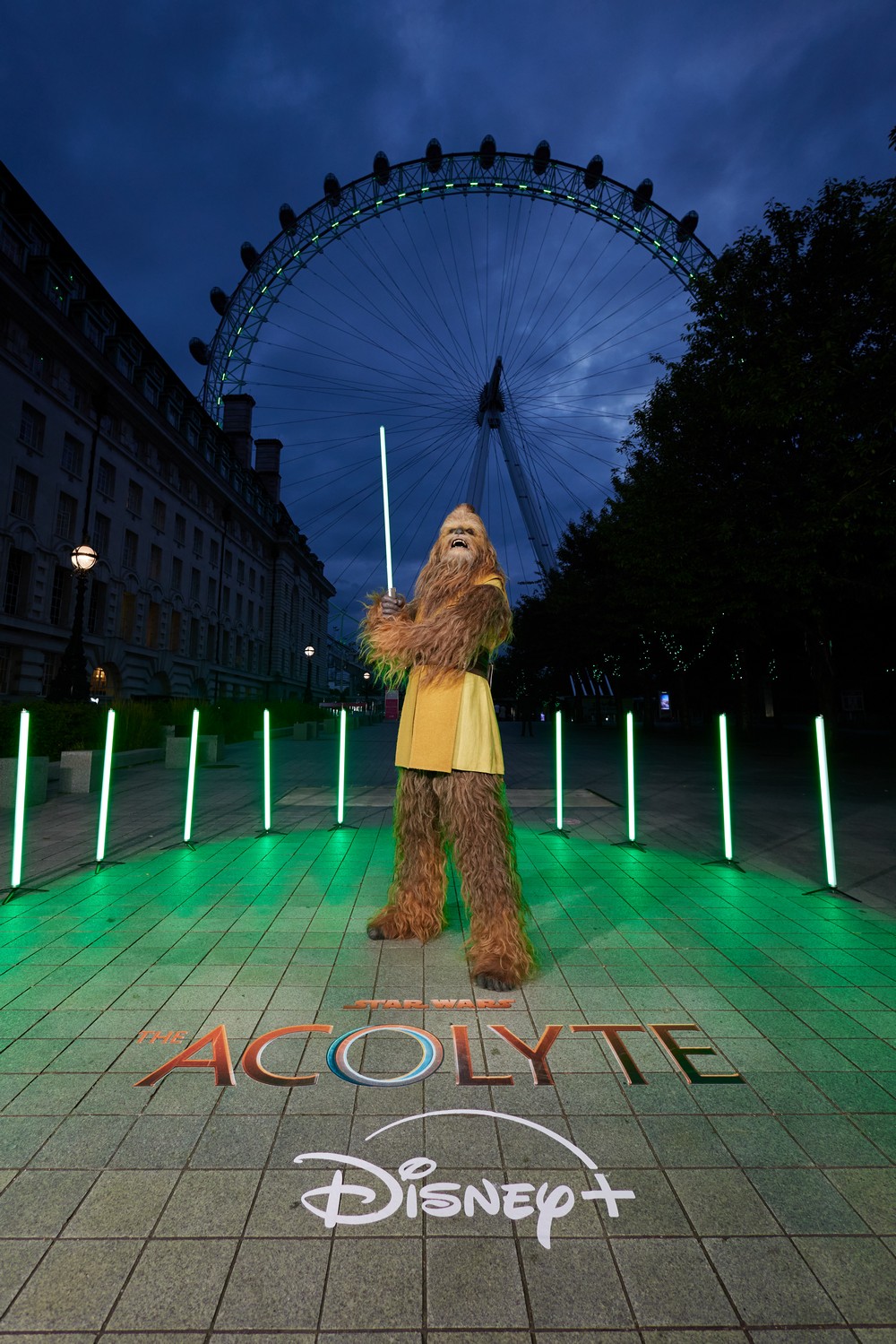 To honour the release of Star Wars: The Acolyte, the London Eye lit up to welcome our live-action Jedi Wookiee, Kelnacca to London. Joining Kelnacca at the London Eye was a host of fans in Jedi costumes holding their lightsabers aloft. The iconic London landmark shone bright green to reflect Kelnacca’s lightsaber. Star Wars: The Acolyte will be exclusively streaming on Disney+ from June 5th.